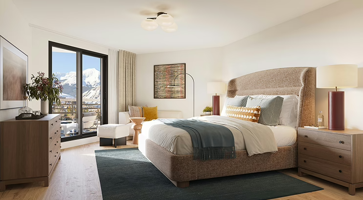 The development includes one, two, three, and four-bedroom residences thoughtfully designed for modern mountain living. Floor plans feature open layouts, expansive windows with alpine views, premium finishes, and integrated ski and gear storage.