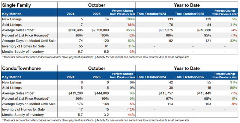 Condos and townhomes had activity similar to last October. Prices have stayed stable, and year-to-date closings continue to rise, reflecting consistent demand in this segment.